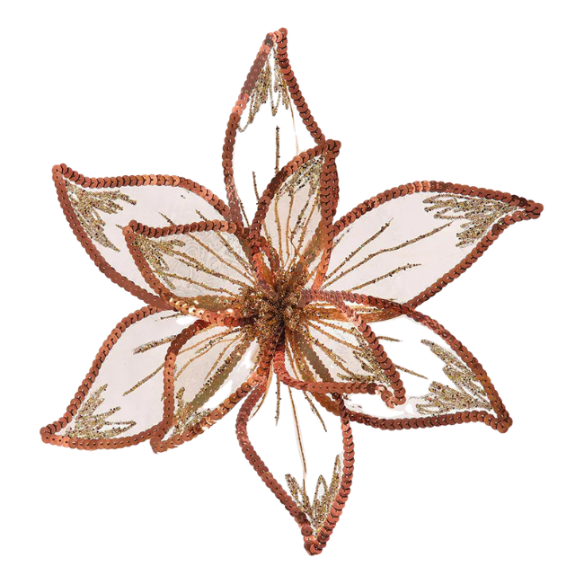 Kurt Adler's Copper & Brown Sheer Poinsettia Pick is a decorative element typically used in holiday and seasonal decor, such as Christmas arrangements, wreaths, centerpieces, or floral bouquets. This pick features artificial poinsettia flowers made from sheer materials in copper and brown colors with gold glittered accents and copper sequined edges, which are reminiscent of the festive and warm hues associated with the holiday season. These artificial poinsettia flowers are designed to mimic the appearance of real poinsettias, a popular Christmas flower. The combination of these warm, earthy tones adds a touch of elegance and sophistication to your holiday decor.