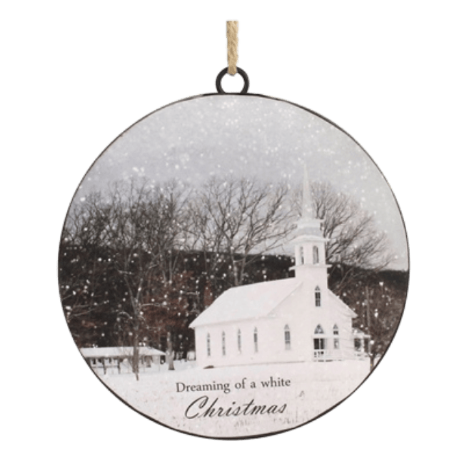 Uniquely crafted with a vintage-inspired design, this White Christmas Church Disc Ornament adds an elegant touch to any holiday tree or decor. The intricate details and white color create a sophisticated and exclusive look, making it a perfect addition for those who appreciate the finer things in life.