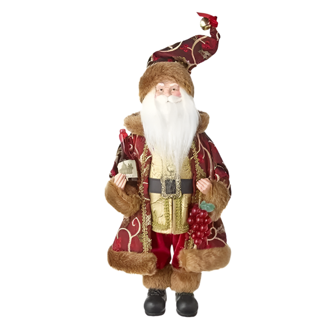 This  "19.25" Berry Wine Santa figurine captures the spirit of the season with rich, warm colors. Dressed in a luxurious burgundy coat accented with gold trim and festive greenery, Santa holds a basket of holly and berries. His joyful expression and intricate detailing make this a standout holiday decoration, perfect for adding a touch of elegance to your festive display!