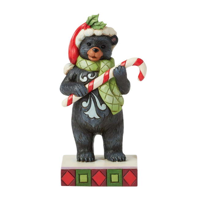 This playful Christmas at the Lodge Jim Shore black bear wears a festive Santa hat adorned with holly, he wears a festive scarf and holds a candy cane in his paws. With rosemaling designs on his fur, the piece brings sweet holiday fun and rustic charm to