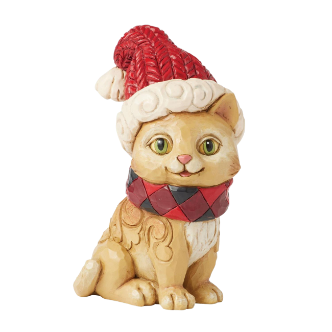 This adorable Jim Shore Highland Glen design features a charming cat donning a cozy knit Santa hat and a festive buffalo plaid collar with a jingle bell. Adorned with vibrant red rosemaling on its fur, he captures the playful spirit of the holidays.