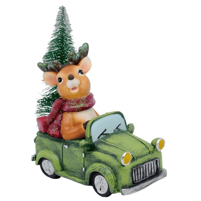 Bring festive cheer to your holiday displays with this charming Deer In Car with Tree Figurine. This whimsical piece captures the spirit of the season with a delightful scene of a deer nestled in a cozy car, complete with a Christmas tree. Perfect for collectors and those seeking unique seasonal decor, this figurine adds warmth and personality to shelves, mantels, or gift displays. Its detailed craftsmanship and cheerful design make it an ideal addition to any Christmas collection or a thoughtful gift for the holiday enthusiast in your life.
