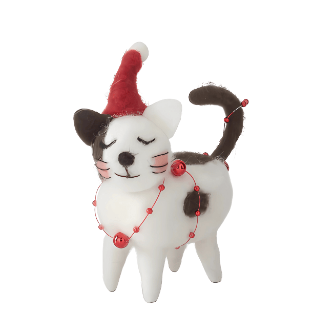 This charming 4.5" wool cat ornament, adorned with a festive red hat, adds a cozy and heartwarming touch to your holiday decor. Perfect for cat lovers, its soft wool material gives a classic, handcrafted feel that brings warmth to any Christmas tree or seasonal display. Celebrate the season with this delightful, supportive companion that captures the spirit of holiday cheer.