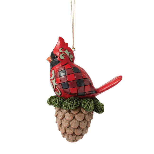 This delightful Jim Shore Highland Glen ornament features a vibrant cardinal adorned with buffalo plaid wings and intricate green rosemaling. Perched gracefully atop a pine cone, this sweet piece captures the essence of winter beauty and holiday spirit.