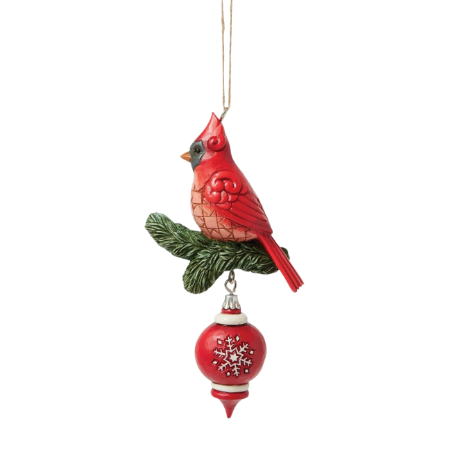 This exquisite Jim Shore Nordic Noel ornament showcases a beautiful cardinal perched gracefully on a monochrome pine sprig, embodying the essence of winter. Below the branch, a snowflake-patterned ornament adds festive charm.