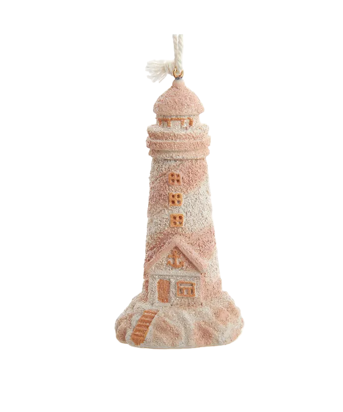 This sand lighthouse ornaments from Kurt Adler is a festive addition to any beach themed holiday décor or Christmas tree. It features a glittered textured sand lighthouse in light pink and white.