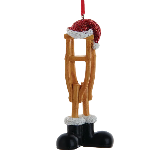 This Santa crutches ornament from Kurt Adler is a festive addition to any holiday décor or Christmas tree. It features a pair of wood-like crutches topped with a red and white glittered Santa hat with black and white boots.