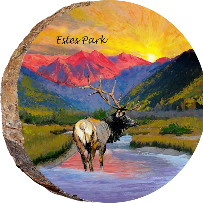 This exquisite Christmas ornament captures the serene beauty of an elk standing majestically in a shimmering mountain stream at sunset. The elk, intricately detailed, appears to drink from the crystal-clear water, its antlers silhouetted against the warm hues of orange, pink, and purple that paint the sky. Towering mountains rise in the background, their rugged peaks softened by the gentle glow of twilight.