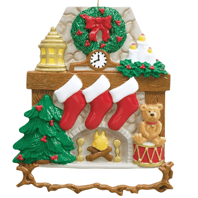 The "Fireplace Stocking 3" ornament features a cozy fireplace adorned with three festive stockings hanging from the mantel. With detailed holiday decorations like garlands, candles, or a wreath, this ornament brings warmth and charm to your holiday decor, capturing the essence of family gatherings and Christmas traditions.