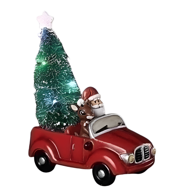 This 5-inch LED Rudolph Santa and Car ornament adds a festive touch to your holiday décor. Featuring Santa with Rudolph in a charming car, it comes with batteries included for immediate display.