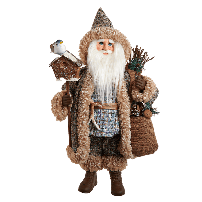 Kurt Adler's Santa holding birdhouse is a wonderful addition to any home or office holiday décor. Santa is featured wearing natural brown colors with tan fur trim and matching boots and hat. In one hand he is holding a glittered bird perched on top of a birdhouse and in the other a foliage filled sack.