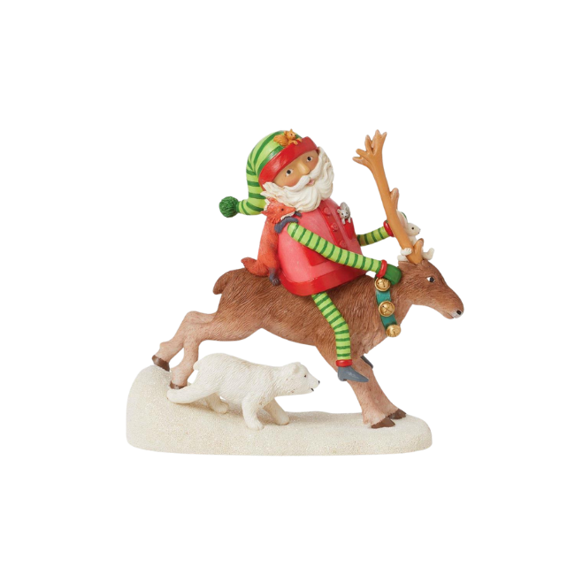 Becky Hampson's Santa's Wild Ride Figurine: Santa is ready for a wild ride with his reindeer and a polar bear, bunny and mouse along for the ride.  6.22in H x 3.15in W x 6.69in L Wt. 1.32 lbs.