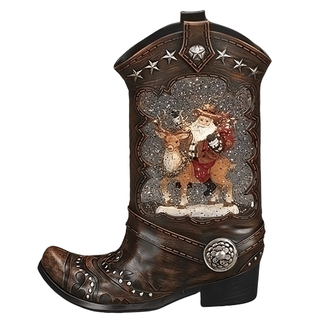 Add a touch of whimsy to your holiday decor with our Santa Riding Deer Boot Shimmer. This unique piece features Santa riding a shimmering deer boot, bringing joy and merriment to any room. Make your home a winter wonderland (ho ho) with this playful decoration.