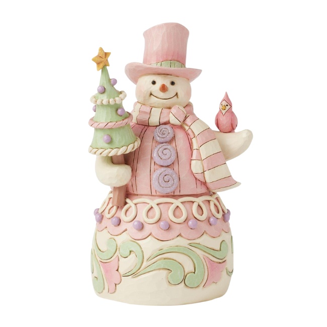This Heartwood Sweets pastel pink snowman by Jim Shore radiates charm with his rosemaling patterns, sprinkles, and icing details, embodying the essence of holiday cheer. He lovingly holds a decorated tree and a cardinal.