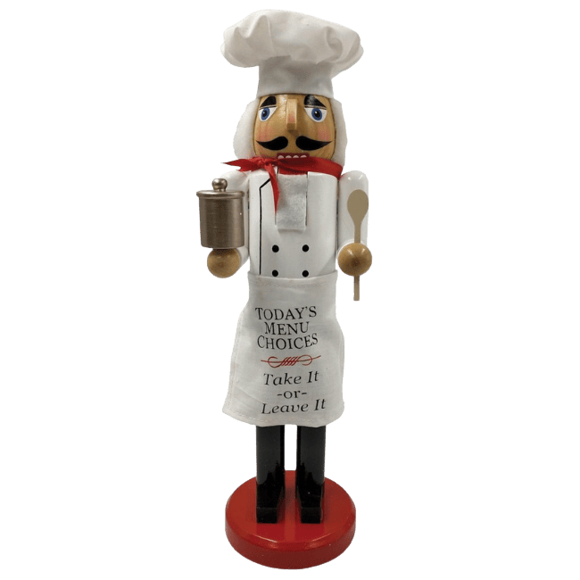 The "Today's MENU Choices" Nutcracker is a unique and charming holiday piece that combines festive decor with culinary fun! This nutcracker features a chef dressed in classic whites, holding a mini chalkboard menu ready to display the day’s specials. With detailed craftsmanship and playful accents, it brings a delightful touch to any kitchen or dining space. Perfect for holiday gatherings or as a thoughtful gift for food enthusiasts, the "Today's MENU Choices" Nutcracker adds a dash of whimsy to your decor, blending holiday cheer with the joy of delicious meals!