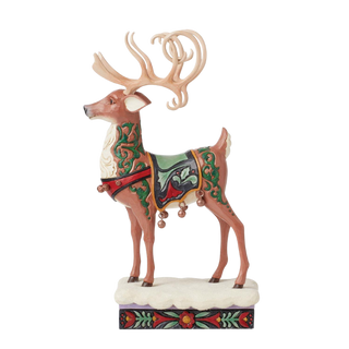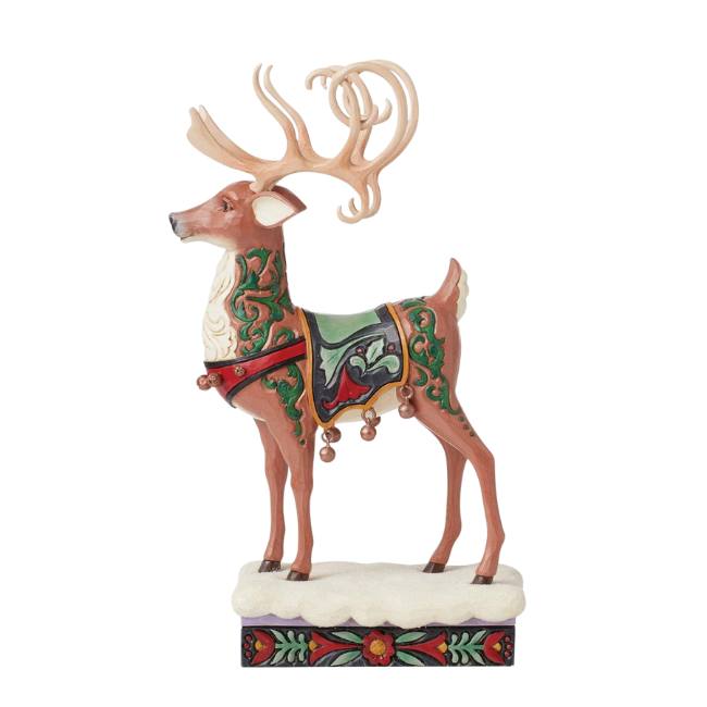 This stately reindeer figurine stands on a stage of snow with pride. With impressive antlers and intricate rosemaling patterning on his hide, he wears a festive saddle and collar of jingle bells. Celebrate Christmastime in style with Jim Shore.