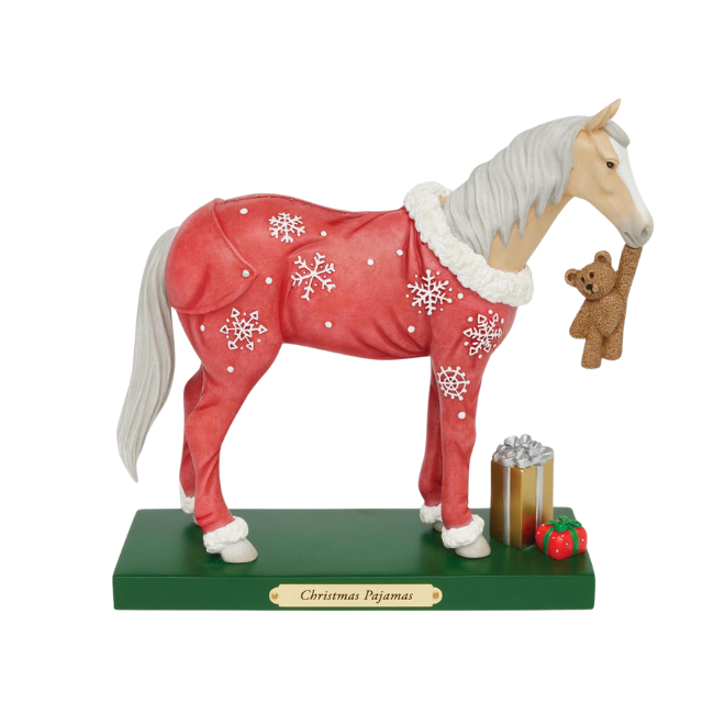 Dressed in festive red pajamas with snowflakes, this playful pony stands beside wrapped presents, with a teddy bear in its mouth. Capturing the excitement of Christmas morning, this charming piece is a heartwarming celebration of holiday wonder.