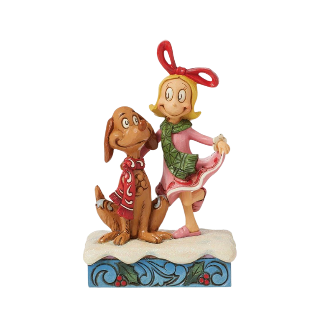 This sweet creation by Jim Shore features Cindy Lou lovingly patting Max the dog. With sweet smiles, the pair might just inspire The Grinch's heart to grow! They wear rosemale details and festive scarves as they sit together in the snow.