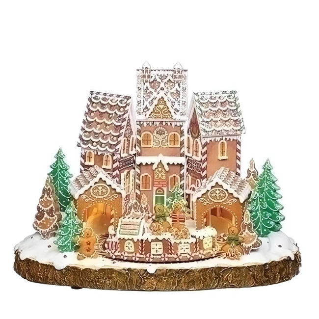 Gingerbread Village is made of durable MDF wood and measures approximately 10 x 10 x 14 inches with detailed cookie texturing; Takes AAA batteries, not included - Cord power capable, NOT included.