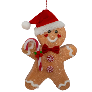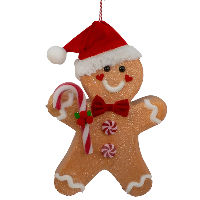 Celebrate the holiday spirit with this charming Gingerbread ornament, featuring a festive candy cane and a cheerful Santa hat. Perfect for adding a warm, joyful touch to your Christmas tree, it brings classic holiday cheer and a cozy, inviting feel to your decorations.