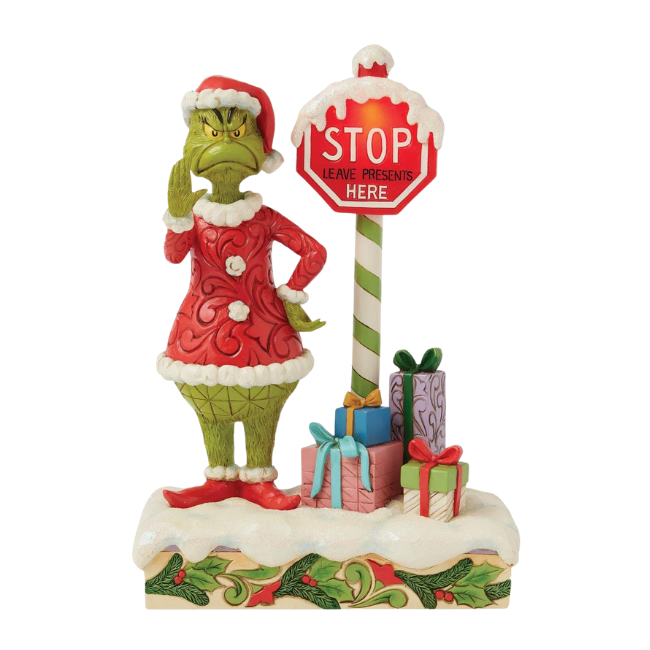 Standing sternly beside a stop sign in his Santa suit, The Grinch frowns and insists that all presents be left with him. With Jim Shore's signature rosemaling and intricate folk art details, the piece captures The Grinch's grumpy holiday spirit.