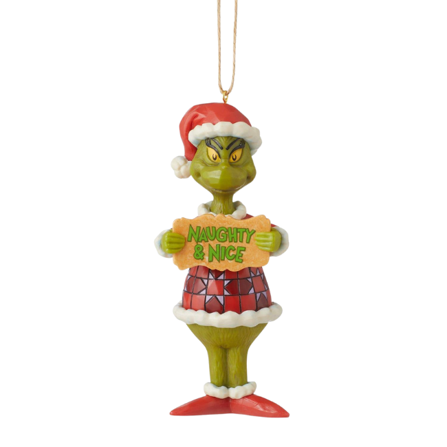 Dressed as Santa, the Grinch smiles his classic smirk with a holiday sign in his hands. With the words Naughty & Nice this ornament gets this humbug's message across with detail and charm. Celebrate another season with Dr. Seuss by Jim Shore.