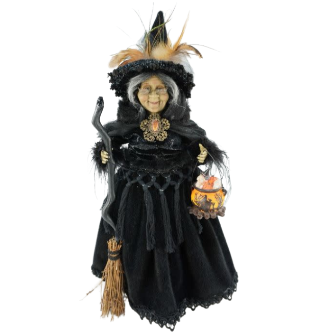 With her ornate appearance, festive embellishments, lighted cauldron, and classic design; this piece is sure to add character and style to any home.