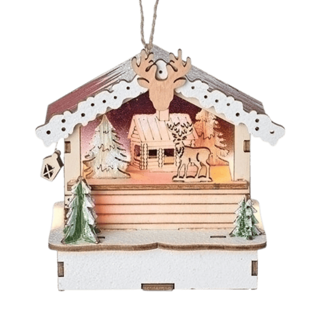 Roman Lit Woodworks Deer Cabin Ornament – Battery Operated. This beautifully crafted ornament is made from wood, showcasing a rustic cabin with a deer design that brings a touch of nature to your holiday décor. It measures 4.53 inches in height, 2.76 inches in width, and 4.53 inches in length. Battery-operated lighting adds a warm glow, enhancing the charm of this woodland-themed piece.