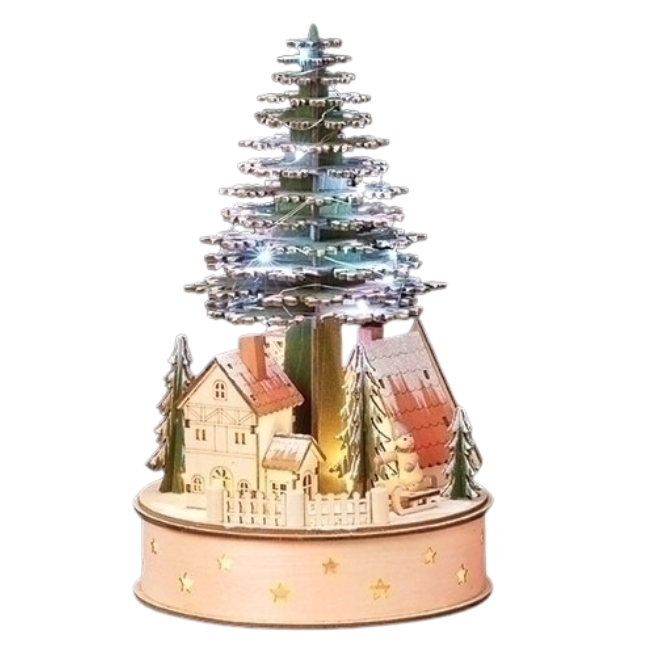 This 12-inch lighted town center scene showcases a picturesque holiday setting with a tree and wood accents. It creates a warm and festive ambiance and is battery operated (batteries not included).