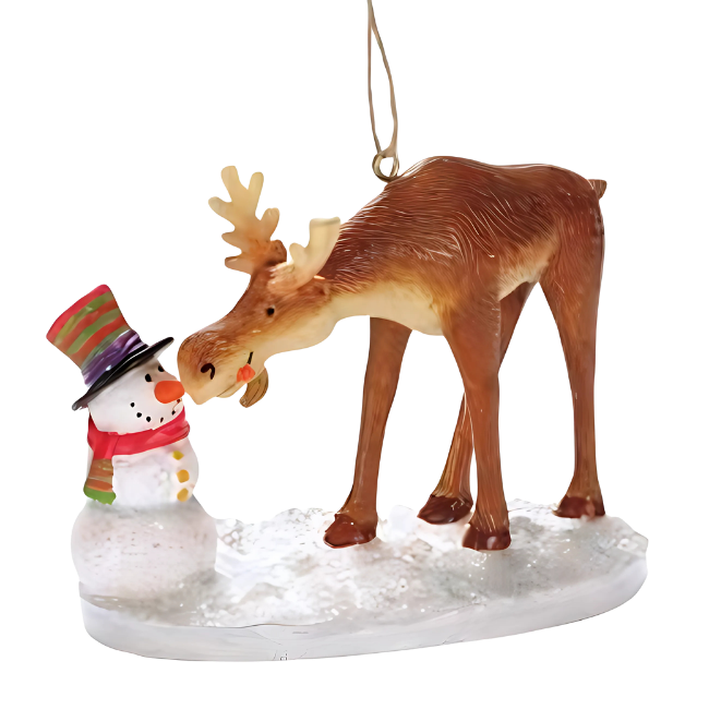 This whimsical resin Christmas ornament features a jolly snowman, carefully crafted with intricate details, gently petting the majestic head of a moose. The snowman's multicolored hat and scarf add a pop of color to the piece, while the moose's gentle eyes and soft fur give it an endearing expression.