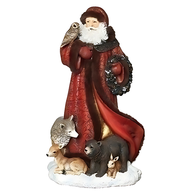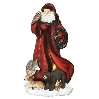 The 15.5" Red Santa with Animals at Skirt Figure depicts Santa Claus surrounded by a charming array of animals at his skirt. The figure showcases Santa in a vibrant red outfit, with detailed animals adding a whimsical and heartwarming touch to the scene. This festive decoration is perfect for adding a joyful and enchanting element to your holiday display.