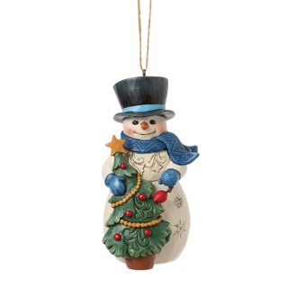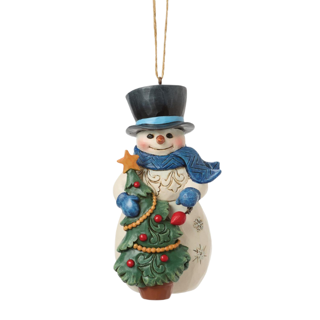 This delightful Jim Shore ornament features a cheerful snowman decorating a tree, radiating joy with a warm smile. With a top hat decorated with holly and a festive scarf, his snowflake-patterned body brings additional winter magic to your home.