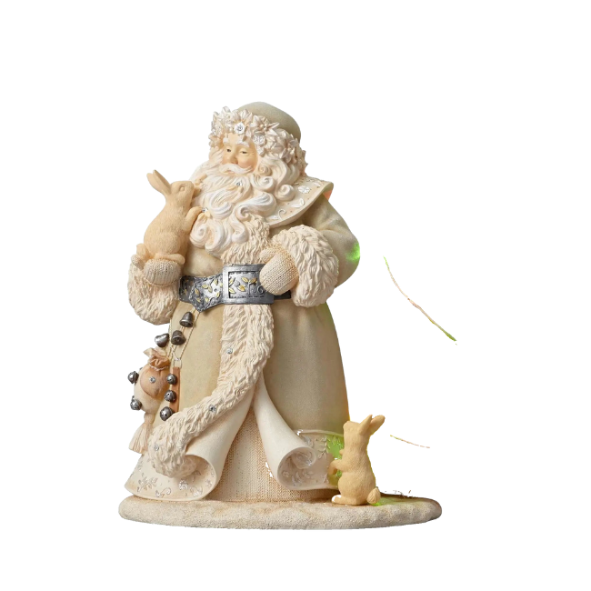 Part of Foundations’ collection, this Let Your Spirits Be Bright Santa is an elegant, stone resin 12” figurine with linen texture and crystal accents. Santa Claus takes a break to visit some of his woodland friends in the glow of the lit-up sisal tree.